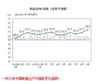 据国家统计局服务业调查中心统计,2017年9月份,中国制造业采购经理指数(PMI)为52.4%,环比、同比分别上升0.7和2.0个百分点,达到2012年5月以来的最高点。中国制造业继续保持稳中向好的发展态势,扩张步伐有所加快。